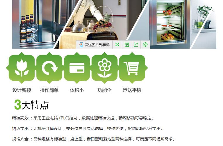 杂物电梯设计新颖、操作简单、具有体积小、功能全、运送平稳等特点,是联合电梯专为宾馆、饭店、食堂、图书馆、医院、幼儿园等场所专门设计的一款不可替代的新型垂直运输工具。